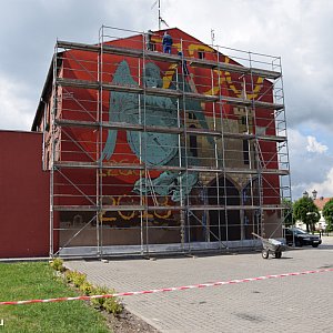 Inowrocławski artysta Marcin Fołda kończy prace nad pierwszym gniewkowskim muralem.
